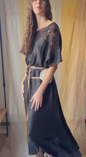 A long loose-fit dress in black silk from the SEMARGL collection. The yoke is handcrafted from the finest silk threads and features the motif of Venetian paradise birds — a symbol of beauty and harmony. The silhouette includes side slits and practical pockets. At the back, an elegant open neckline with a belt accent adds refinement and charm.