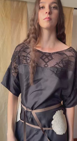 An elegant long black silk dress from the SEMARGL collection. The yoke is handcrafted from the finest silk threads and adorned with the symbol of the winged lion — an ancient motif uniting Venetian tradition with Slavic mythology. The flared silhouette with side slits is complemented by practical pockets. At the back, a refined open neckline with a belt detail highlights the elegance of the design.